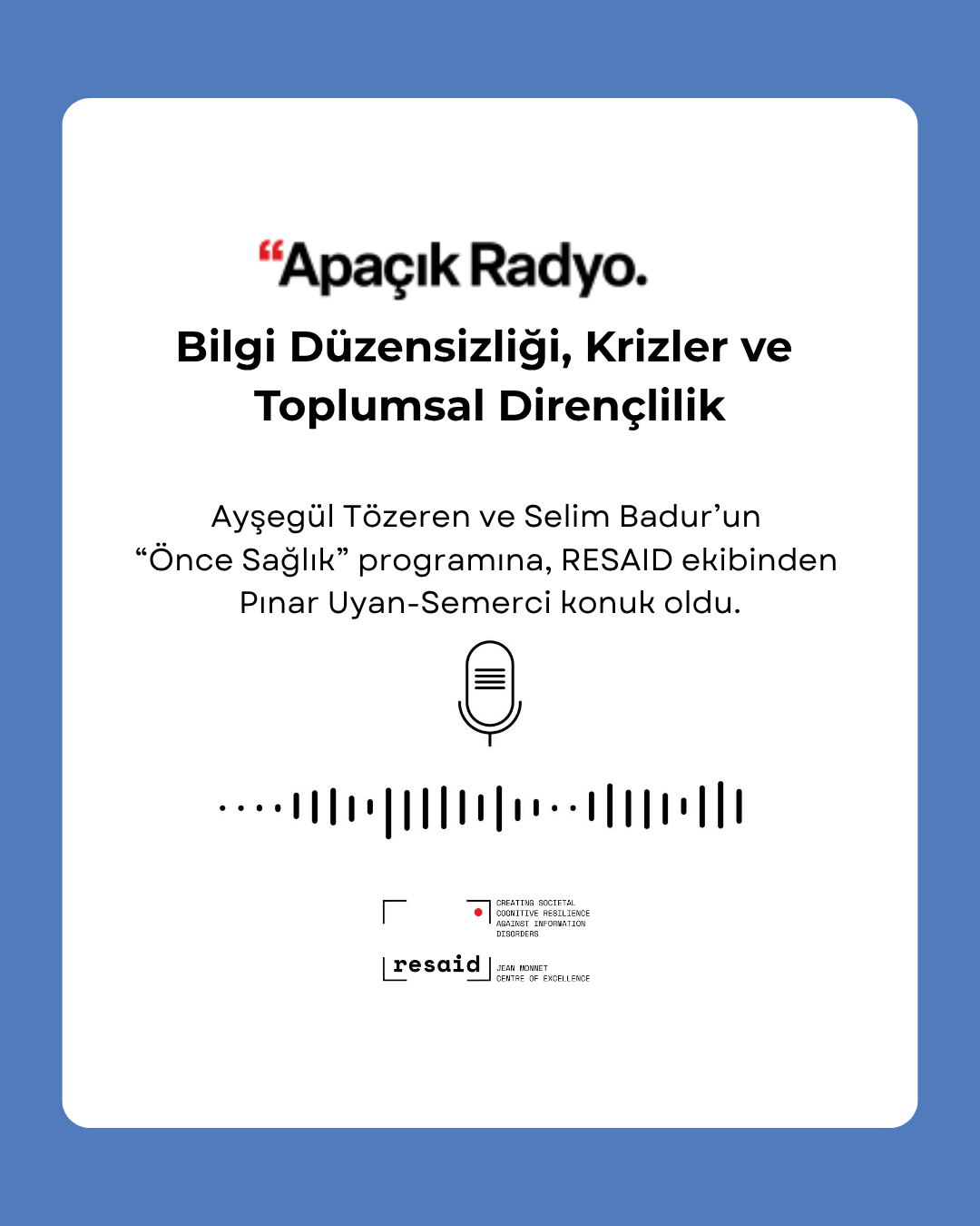 Apaçık Radyo’da yayımlanan, Ayşegül Tözeren ve Selim Badur’un sunduğu “Önce Sağlık” programının son bölümüne; RESAID ekibinden İstanbul Bilgi Üniversitesi öğretim üyesi Prof.